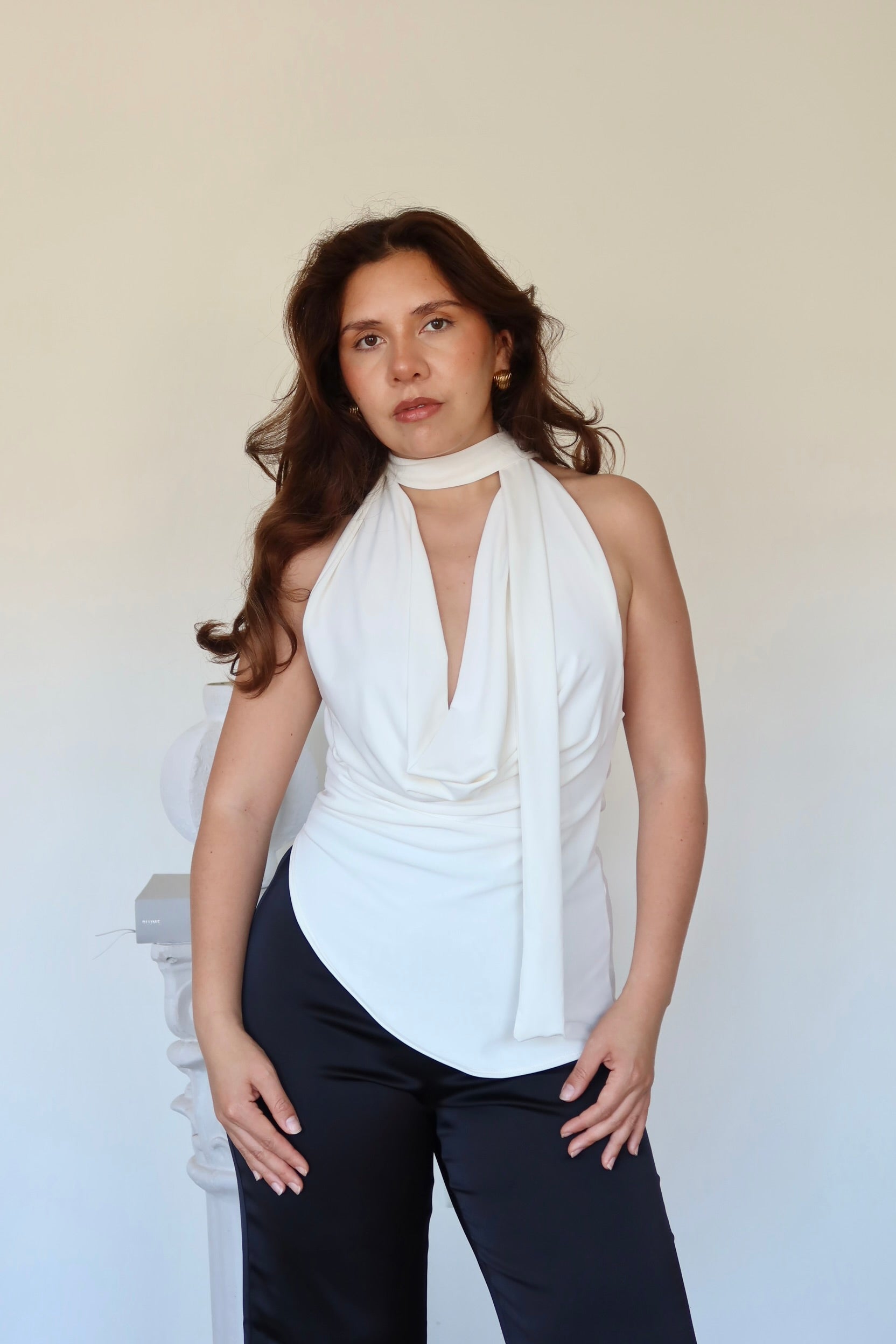 Top de calce holeado con escote drapeado profundo y cuello incorporado tipo pañuelo. Su diseño asimétrico en el bajo aporta movimiento y sofisticación. Confeccionado en tela suave y elasticada para un ajuste cómodo y elegante